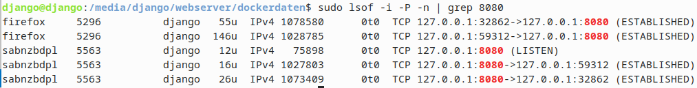 Um herauszufinden, welche Anwendungen die Ports belegen, natürlich können das auch laufende Container sein, ist folgender Befehl hilfereich: