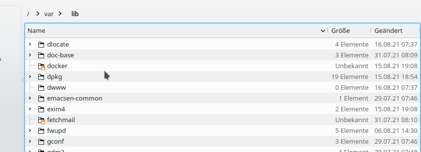 Die Images und Container werden in diesem Pfad abgespeichert, aber nicht namtlich erkennbar, sondern mit SHA256-Codenamen. Somit sind diese Dateien außerhalb der Einflussnahme durch den User, also durch mich. Ich kann nur das Management betreiben. So sieht der Ordner im Midnight-Commander aus: